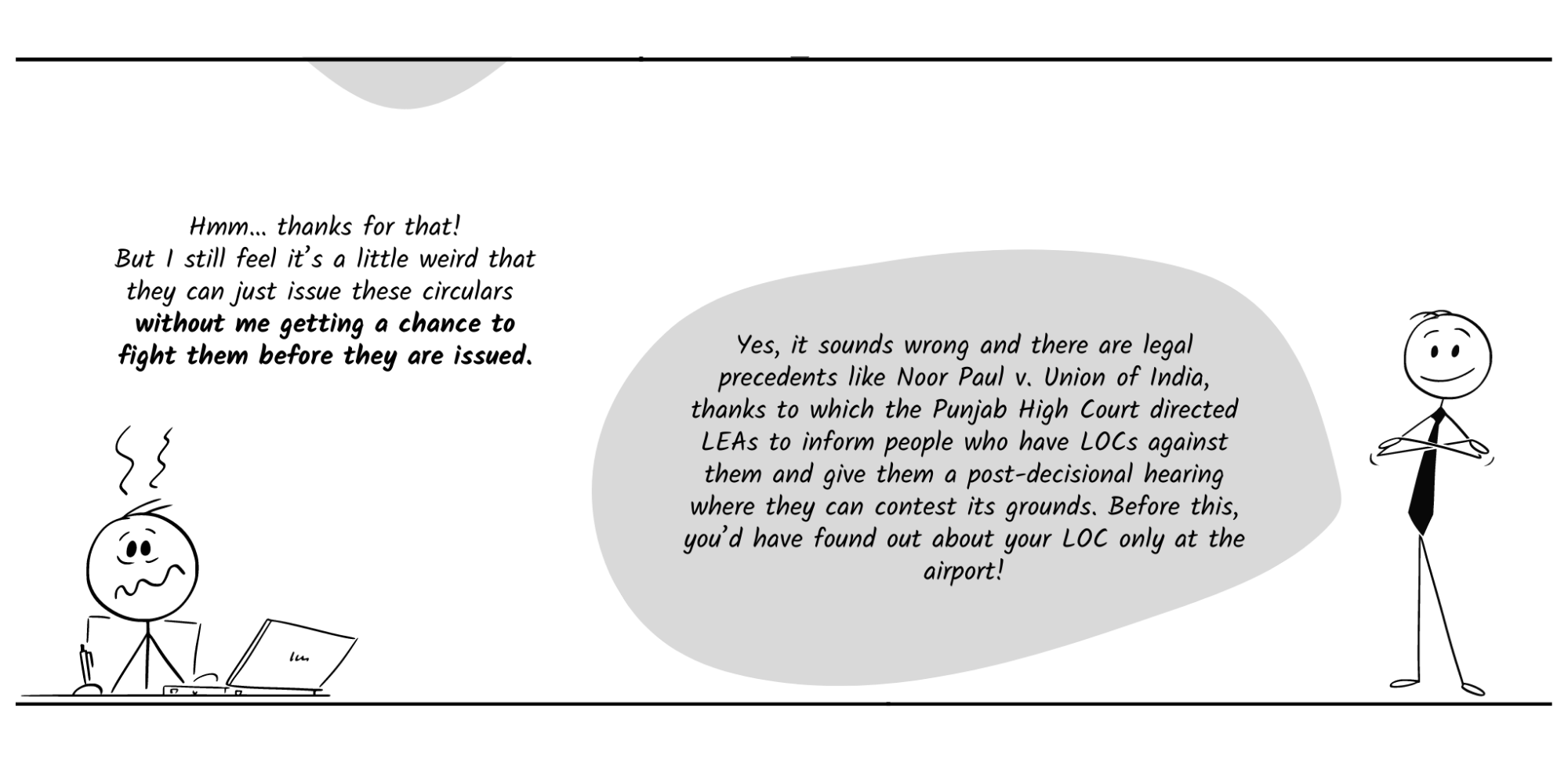 Authorities usually do not provide a copy of the LOC to the individuals and often claim LOCs to be an internal departmental document. However, recently the Punjab and Haryana High Court in Noor Paul vs Union of India & Others has held that the issuing authority should provide a copy of the LOC to the subject person as soon as it is issued and provide them with a post-decisional hearing. This decision has been appealed before the Supreme Court of India but as of now, there is no stay on it.